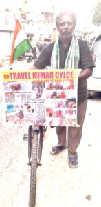 పర్యటకం అంటే ఇష్టం ఉండని వారు ఎవరూ ఉండరు. ఎక్కడికైనా వెళ్లాలి అంటే ముందుగా గుర్తుకు వచ్చేది ఏ రైలో, బస్సో, కారో కానీ బెంగళూరుకు చెందిన ముత్తు కుమార్ సైకిల్పైన యాత్ర తనకు ఎనలేని అనందాన్ని ఇస్తుందని అన్నారు. ముత్తుకుమార్ ఇప్పటి వరకు మూడు సార్లు సైక్లింగ్ యాత్రలు చేసినట్లు తెలిపారు. ప్రస్తుతం నాలుగో సారి సైకిల్పై బెంగళూరు నుంచి కాశీకి వెళ్తూ నగరంలో గోల్కొండ వద్ద కనిపించారు. బెంగళూరులో ఎలక్ట్రిషియన్ పని చేశానని, సాఫ్ట్వేర్ రంగంలో పని చేస్తున్నట్లు తెలిపారు. ముత్తుకుమార్ సైకిల్ పై మొదటి సారి చెన్నై నుంచి కాశీ, రెండోవ సారి రామేశ్వరం నుంచి కాశీ, మూడోసారి బెంగళూరు నుంచి కాశీకి వెళ్లి వచ్చినట్లు తెలిపారు. ఈ యాత్ర తనకు నాలు గో సారి అని అన్నారు. తనకు సైకిల్పై ప్రయా ణం అయనకు అనందాన్ని ఇస్తోందని చెప్పారు.
