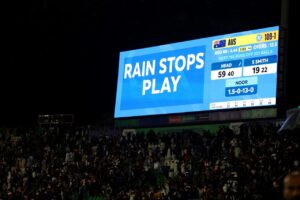 274 పరుగుల లక్ష్యంతో బరిలోకి దిగిన ఆస్ట్రేలియా వర్షంతో ఆట నిలిచిపోయే సమయానికి 12.5 ఓవర్లలోనే వికెట్ నష్టానికి 109 పరుగులు చేసింది. ఆది నుంచి ఎదురుదాడికి దిగిన ఆసీస్ ఓవర్కు 9కి పైగా రన్రేట్తో పరుగులు సాధించడం విశేషం. ట్రావిస్ హెడ్ (40 బంతుల్లో 59 నాటౌట్; 9 ఫోర్లు, 1 సిక్సర్) దనాధన్ ఇన్నింగ్స్తో అలరించాడు. వర్షం తగ్గకపోవడంతో మ్యాచ్ రద్దయినట్లు అంపైర్లు ప్రకటించారు.