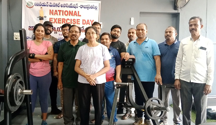జాతీయ వ్యాయామ దినోత్సవం సందర్భంగా సిరిసిల్ల జిల్లా ఐఎంఏ ఆధ్వర్యంలో వేములవాడ రెండవ బైపాస్ రోడ్డు లోని వ్యాయామ సెంటర్లో వ్యాయామం చేశారు. ఈ సందర్భంగా ఐఎంఏ అధ్యక్షులు డాక్టర్ నాగమల్ల శ్రీనివాస్ వ్యాయామం వల్ల ఆరోగ్యం బాగుంటుందని, గుండె జబ్బులు, షుగర్ తో పాటు ఇతర వ్యాధులు రాకుండా వ్యాయామం కాపాడుతుందని అన్నారు. ప్రతి వ్యక్తి తన దినచర్యలో భాగంగా వ్యాయామం చేయాలని కోరారు .డాక్టర్ నాగమల్ల పద్మలత మాట్లాడుతూ పిల్లలలో వ్యాయామం వల్ల జ్ఞాపకశక్తి పెరగడంతోపాటు ఎదుగుదల బాగుంటుందని, చిన్నప్పటినుండి తల్లిదండ్రులు తమ పిల్లలకు వ్యాయామం పట్ల అవగాహన కల్పించాలని కోరారు. గర్భిణీ స్త్రీలు వ్యాయామం చేయడం వల్ల నార్మల్ డెలివరీ అయ్యే అవకాశం ఉంటుందని అన్నారు. ఈ కార్యక్రమంలో ఐఎంఏ ఉపాధ్యక్షులు డాక్టర్ చికోటి సంతోష్ కుమార్, డాక్టర్ ఆనంద్ రెడ్డి, డాక్టర్ సంతోష్, అనిత, దీప్తి, వర్ష, నామాల ప్రదీప్, డాక్టర్ రాజేందర్, సంతోష్ తదితరులు పాల్గొన్నారు